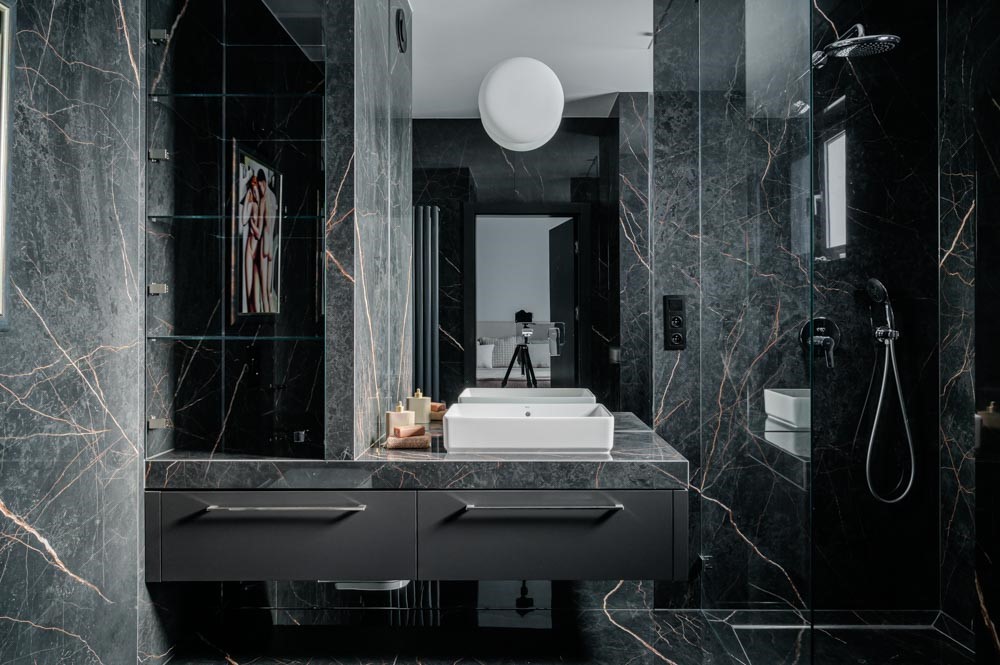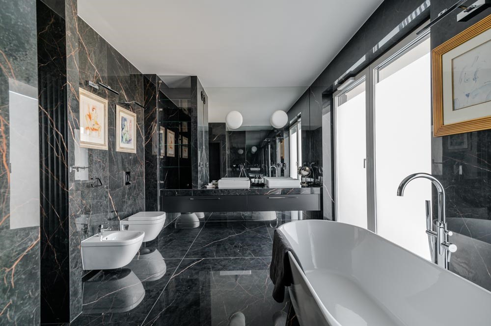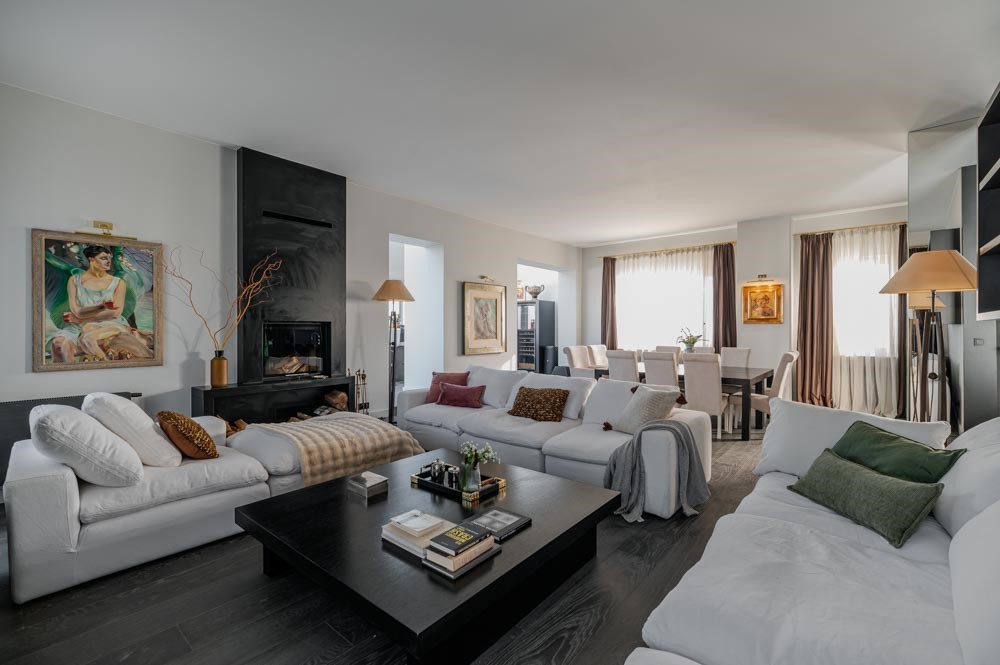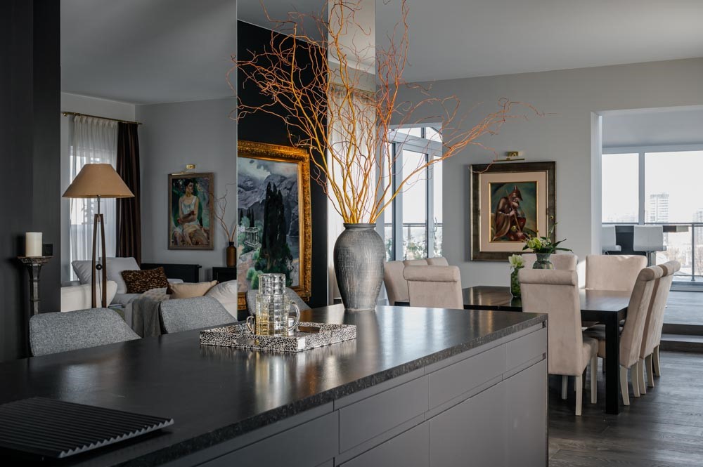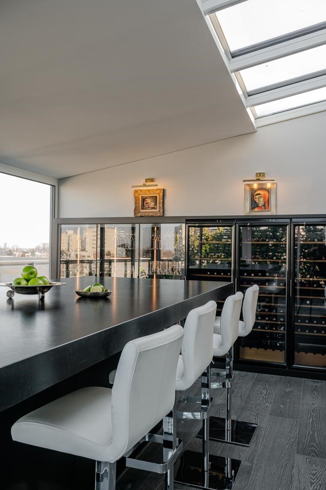 Dwupoziomowy penthouse o powierzchni 196 m², położony na ostatnim piętrze kameralnego budynku w otoczeniu zieleni. Dostęp do przestrzeni mieszkalnej zapewnia cichobieżna winda, obsługująca również poziom garażu podziemnego i wjeżdżająca bezpośrednio do penthouse’u. Wnętrze oferuje imponujący salon o dużej powierzchni, otwartą kuchnię z centralnie umieszczoną wyspą, dwie przestronne sypialnie, dwie łazienki, toaletę dla gości, dwie garderoby, gabinet oraz pomieszczenie gospodarcze. Dwa przestronne tarasy oraz oranżeria z widokiem na Warszawę i zieloną część Bielan tworzą wyjątkową przestrzeń do relaksu. Do dyspozycji mieszkańców są miejsca postojowe w garażu podziemnym oraz komórka lokatorska. Bryła budynku utrzymana została w klimacie modernizmu.